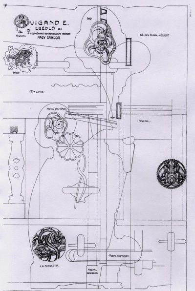 Az itt bemutatott nagyméretű kiviteli rajz a tálas, a pad és az asztal elkészítéséhez nyújtott segítséget. A díszítmények, faragások és fémveretek rajzát is közzétették. Nagy Sándor több alternatívát is megrajzolt a kivitelezők számára: körbe komponált virágokat, illetve rókákat kínált a bútorok díszítéséhez.