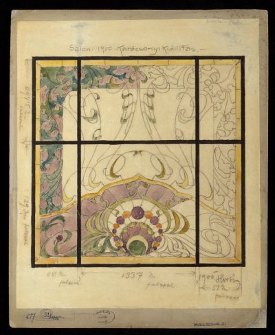 Az Iparművészeti Társulat 1900. évi karácsonyi kiállításán bemutatott hatosztatú üvegablak tervrajza. (A Walterr Gida által kivitelezett üvegablakról készült archív fényképfelvételt ld. IM Adattár, FLT 2724). A középmezők mozgalmas vonalvezetése Victor Horta stílusát idézi.