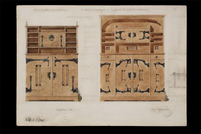 A szekrény kisebb, alul kétajtós változatának stilizált növényi elemekből szerkesztett veretei egyenesek, felső részét lenyitható lappal zárt rész és 12 polc alkotja. Az alul négy, felül kétajtós szekrény veretei kissé hullámzóak, megtörtek, a bútort felül karéjolt lap díszíti.