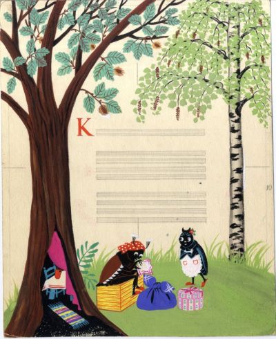Ezen a lapon is visszaköszön Lukáts elegáns stílusa, amely minden esetben kiválóan illik a megjelenítendő szöveghez. A finom vonalakkal megrajzolt két fa között tréfás jelenet szemtanúja lehet a néző. Kis ládáján piros pettyes fejkendőben ülő bogár épp csomagol, előtte útra kész motyói állnak, régi lakása a bal oldali fa odujában található.