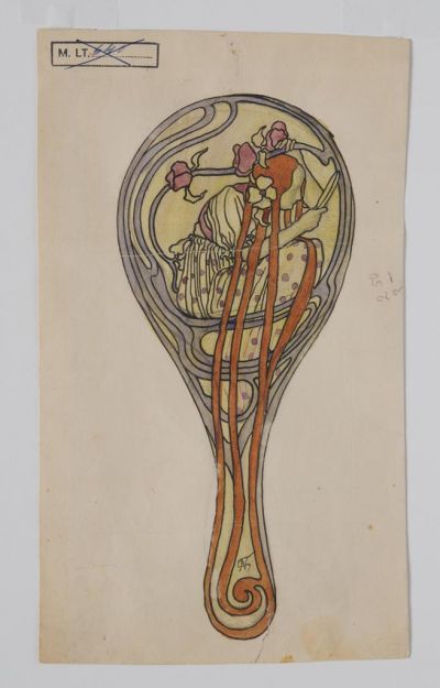 összefonódva alkotják a kézitükör hátlapjának és nyelének dekoratív keretét, hangsúlyozva a kecses formát. A terv készülésének ideje nehezen állapítható meg, annak ellenére, hogy