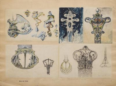 Sajátos világa a néhány évvel később született, kissé groteszk iparművészeti vázlatain bontakozott ki. Ezek között számtalan ékszerterv is szerepel, de az övcsatoknál, függőknél,