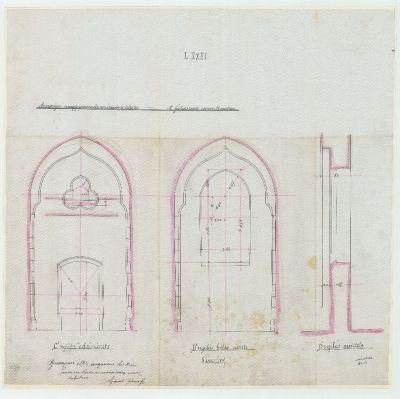 Tervrajz - Iparművészeti Múzeum-a földszinti előcsarnok melléklépcső felőli ívezeteinek metszete és nézete