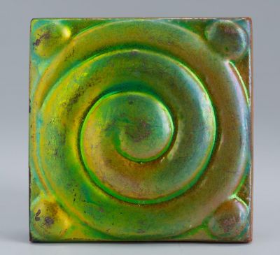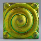 A kis négyzetes csempén plasztikus csigavonal, négy sarkában egy-egy domború petty. Felületén egyszínű eosinmáz, amely a mélyedésekben megülve zöld színnel kereteli a domborulatok aranyos színét.
