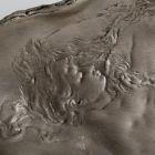 Hosszúkás, szabálytalan alakú és peremű, lapos tál. Öblében lapos dombormű: női aktfigura hullámok közt.