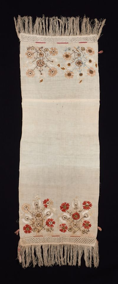 Anyag: | ezüst színű fémfonal; pamutvászon; selyem |