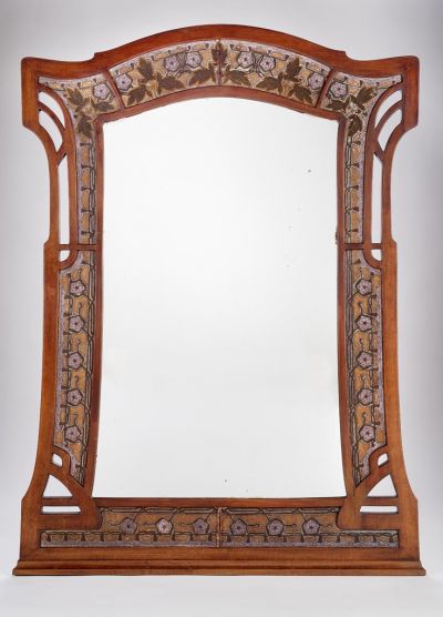 A tükör álló téglalap alakú és ívelt lezárású. Érdekessége a színes, leveles-virágos gyöngymozaik-betét, mely a faragott diófa-keretet díszíti. A megmunkálás igényessége alapján feltételezhető Horti Pál szerzősége, kinek faragott keretei a Magyar Iparművészetből közismertek, Tausig Siegfried kivitelezésében. Hasonló keretei közül 1898-ban az Iparművészeti Társulat karácsonyi tárlatából vásárolt a minisztérium is, e darab utóbb Szekszárdra került. 1901-ben a párizsi kiállításról visszaszállított tárgyak árverésén több Horti tükörkeret szerepelt, tükörrel együtt (l. IM Adattár 1902/5 irat).
