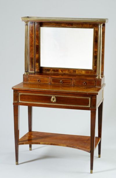 Négy, bronzpapucsba bújtatott, felfelé szélesedő, hasábos lábát elöl ívelt vonalú polc köti össze. Kávájában egy fiók, homloklapján fekvő, hossznégyzetes betétmezővel, középen füzérdíszes kulcslyukpajzzsal. A betétmező aranyozott szalagkeretelésű. Hossznégyzetes asztallapján dupla, rézfilés mező mögött keskeny felépítmény: alul három kis fiókon két-oldalt egy-egy bronzzal ékesített vájatok oszlop tartja a kicsit kiugró márvány fedőlapot, amelynek három oldalán alacsony áttört bábos perem fut körbe. Az oszlopok között fekvő téglalap alakú tükörkeret, tükörrel.