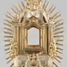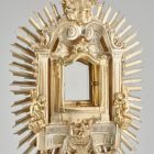 Talpa ovális, tagolt, középső sávjában poncolt felületen hullámvonalas és virágos díszítésű, felső részén gerezdelt, ezen baluszter alakú, vályúzatos szár. A monstrancia felső része plasztikusan formált architektonikus keret, dicsfénnyel, középen szentségszekrény, felül az Atyaisten áldásra emelt jobbkézzel, kétoldalt egy-egy angyalfigura. A keret oszlopos fülkét imitál, közép felé két volutából hajlított ívvel zárt.
