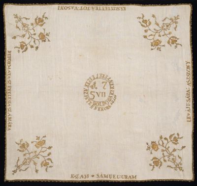 A kendő sarkaiban egy-egy virágtő. Kettős száruk egy tőből ered, szétválik, összefonódik, majd keresztezik egymást. A szárakon három gránátalma, apró levelek és bimbók. A fémfonal a fátyolszerű vásznat erősen összehúzza, ezért a mintázat rajza kissé zavarossá válik. Az oldalak mentén és a kendő közepén dedikációs felirat: KAZAJI SAMUEL URAM / LEVÁJI SÁRA ASSZONY / KÉSZITTETTE A TOT VASONYI REFORMATA SZ. EKKLESIA SZÁMÁRA.