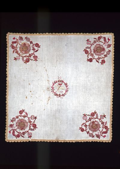 Vékony, fehér lenvászon, borvörös, fehér színű selyem- és ara­ nyozott ezüstfonalas hímzéssel nyers színű selyempaszománttal. Négy sarkában apró gumóból kinövő, török eredetű, csigásan hajló, nagy virágos inda. A kör alakban kanyarodó virágszál középmotívuma egy nagy nyolcszirmú rozetta, amit a csigavonalas száron áthajló kis zárt gránátalmák, négyszirmú virágok, hosszúkás levelek és a virágtőből kiágazó tulipán zárnak körbe. A virágok és levelek változatos sávos-geometrikus kitöltése még változatosabbá teszi a mozgalmas mintát.