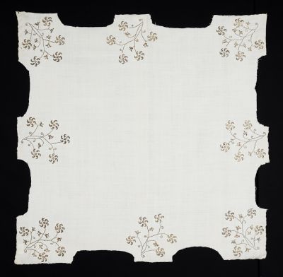 Technika: | hímzett; kétoldalas fémfonalas lapos öltés; száröltés |