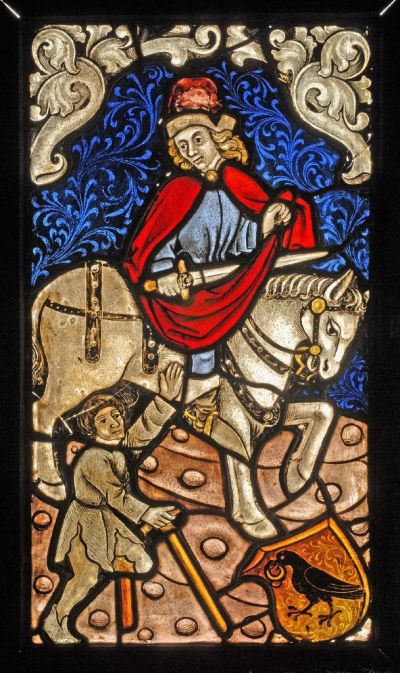 Álló formátumú, csaknem ép állapotú, teljes ablakbetét lóháton ülő, a könnyűlovasok öltözékét viselő, köpenyét levágó és koldusnak nyújtó Szent Márton képével. A jelenet hátterét fekete alapon kék indamustra tölti ki, terét fent leveles ágakból alkotott, plasztikus hatású, grisaille-festésű baldachin-motívum zárja. A festett üvegrészek több helyen töröttek, a lovas-alak süvegén kisebb hiány van. A kép jobb alsó sarkában döntött címerpajzs helyezkedik el. A címerben arany indadíszes alapon csőrében gyűrűt tartó fekete holló: minden bizonnyal a Hunyadiak családi jelvénye.