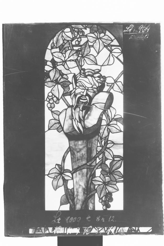 Üvegnegatív - ablakfestmény, faun szobra szőlőágak között, Róth Miksa tulajdonában
