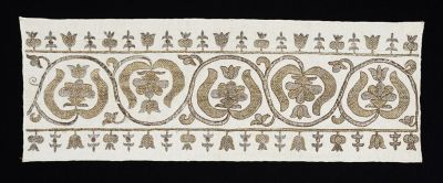 Technika: | laposöltés; mintásan letűzött fémfonalas hímzés; száröltés |