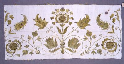 Anyag: | aranyszínű fémfonal; sodratlan selyemfonal; vászon |