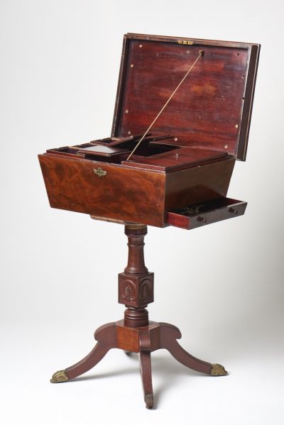 Palmettadíszes központi balluszter lába bronzpapucsba bújtatott, talpazata négy ívelt tagon nyugszik. Felső része koporsó alakú, felnyitható lapja alatt rekeszes kialakítású alsó részében egy fiók.