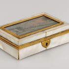 Fából készült, fekvő hasáb alakú test felnyitható fedéllel. Gyöngyház lapokkal borított, élei mentén tűzaranyozott sárgaréz montírozás, homloklapján préselt díszű tűzaranyozott sárgaréz kulcslyukpajzs. Fedelén tűzaranyozott sárgaréz keretben papírra festett gouache miniatűr látkép felirata: Wien vom Galizinberg.