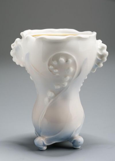 Négy felgyűrt levélszár-lábon álló kehelyforma test. A lábak felől négy plasztikus gyöngyvirágtő simul a vázatestre, fent két gyöngyvirágszál magasan kiemelkedik az edényfalból, a virágszálak ívelten visszahajlanak, a váza szájpereme virágszirmokra emlékeztetően finoman visszahajlik. Valaha fedeles tárgy lehetett, mivel betétkarimás, a betétkarima arannyal festett. Színezése-festése különösen halvány, kék és barna árnyalatokkal.