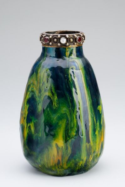 Kerek talpon alul kissé kiöblösödő, szája felé összeszűkülő, szájperemén ékköves foglalatú vázácska. Testét folyatott kerámiamázra emlékeztető, összemosódó sötétkék-zöld-sárga-okker színű, Rapoport Jakab nevéhez fűződő ún. felhős zománc borítja. Szájperemét kis gömböcskék között váltakozva egy-egy gyöngyházlapocskával és vörös kővel díszített gyűrű övezi.