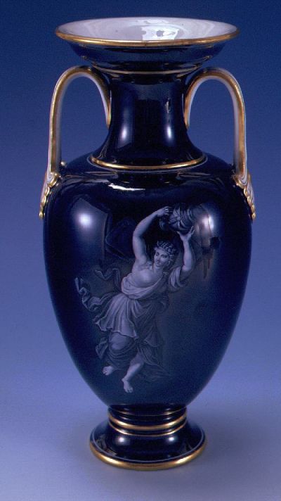 A historizmus stíluskorszakában készült tárgy nemes arányú antik vázaforma, színei magasfényű sötétkék (kobalt), fehér és arany. A kék alapra felvitt festék vékonyabb rétege alatt a sötétkék, kobalt alap tűnik át, a több rétegben felvitt festék vastagabb, testesebb, ez a különlegesen finom festés fokozza az alakok plaszticitását.