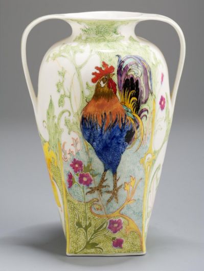 Négyzetes talp fölött hengeres, körtealakú test, nyaka rövid, ívelt, pereme kihajló, két szalagszerű lapos füle a peremhez illeszkedik. A váza egyik oldalán tollait felborzoló kakas, virtuóz festése kék, barna, sárga, lila, bordó színekben pompázik, árnyalása és kontúrozása fekete. A kakas élénk színei sajátos kontrasztban állnak a háttér halvány pasztell színeivel, a stilizált indákkal, levelekkel, apró virágokkal a váza másik oldalán fodros szirmú narancssárga tulipán, körötte stilizált növények, indák, ágak, levelek.