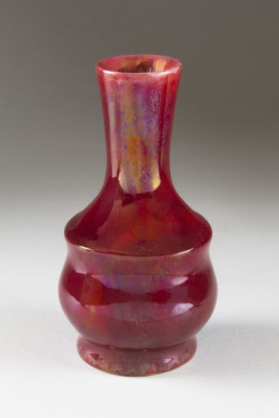 Technika: | öntött; redukáltan égetett fémlüszter; ún. ökörvér (sang-de-boeuf) máz; vörös mázzal fedett |