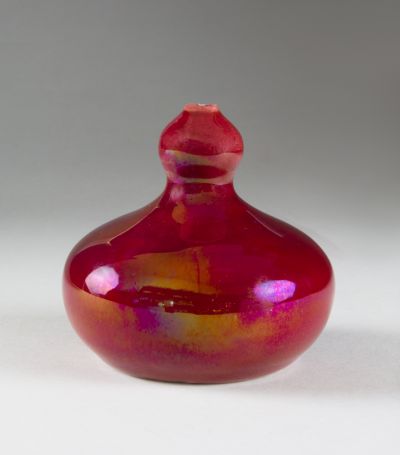 Technika: | redukáltan égetett fémlüszter; ún. ökörvér (sang-de-boeuf) máz; vörös mázzal fedett |
