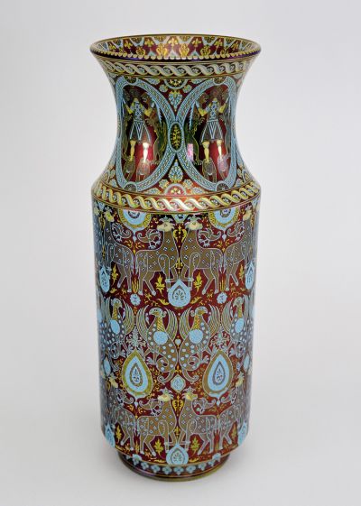 A váza felületét díszítő, fémlüszterrel festett keleties motívumok – melyek a Zsolnay-gyári dekorkönyvben 2431. szám alatt találhatók be rajzolva – két bizánci selyemszövet mintáját követik, melyeket a középkor óta a burgundiai Sens székesegyházának kincstárában őrznek. A katedrális gazdag textilgyűjteményéről a Gazette des beaux-arts című folyóirat 1880. évi számában jelent meg részletes ismertetés, amely a Zsolnay-váza dekorjához előképül szolgáló selyemszövetek reprodukcióit közölte. (Anatole de Montaiglon: Antiquités et curiosités de la ville de Sens. IV. Les étoffes du Trésor de la cathédrale. Gazettedes beaux-arts, 22. [1880], 242–261.)