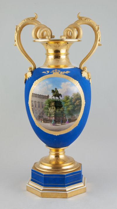 A kék színű edénytest oldalán berlini városkép, az előtérben Nagy Frigyes lovasszobrával, melyet 1851-ben állítottak fel a Lindenforumon.