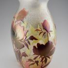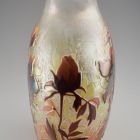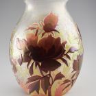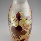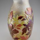 Ovális alapú, ellipszoid testű, öblös vázaforma, beszűkülő, rövid nyakkal, szögletes, kissé kihajló szájperemmel. Az egész testen a felső barna réteg teljes, illetve részleges lemaratásával kialakított, sötétebb, illetve világosabb barna őszi lombok, sárgás-rózsaszínes tónusokkal. Az egész felület selymesen irizáló. A díszítőmotívumok a nemzetközi szecesszió stíluselemeinek egyéni hangvételű felhasználását mutatják. Lehetséges, hogy a kortárs méltatásban „Tiffany utánzatként” említett üvegek egyike.