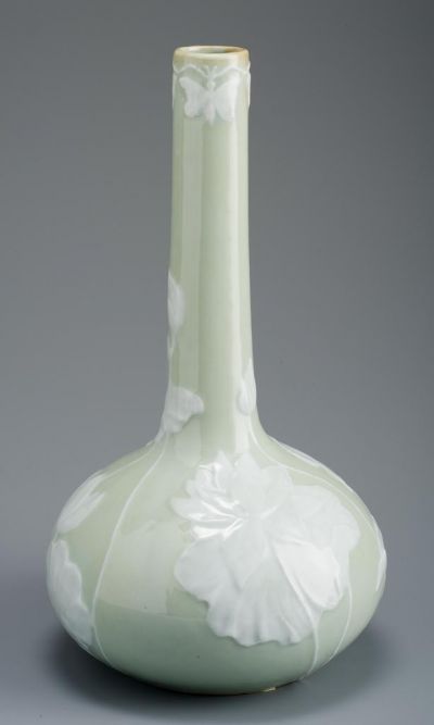 Kissé lapított gömb alakú vázatest, hosszú, felfelé enyhén keskenyedő nyak, egyenes perem. Az anyagában színezett szürkészöld alapon megjelenő plasztikus fehér díszítmény motívumai: mozgalmasan hajladozó tavirózsa virágok, bimbók, szárak és levelek a barnás foltos perem alatt hullámvonal, alatta három kiterjesztett szárnyú lepke.