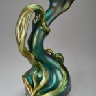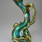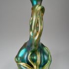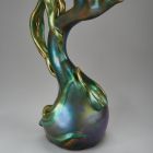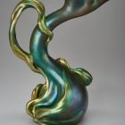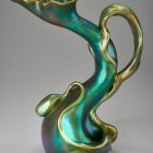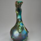 A horpadt tömlőre emlékeztető alsó vázatestből S alakban meghajló, hosszú nyakszár nő ki. A kiöblösödő szájnyílás előrenyúlik, ovális, fodorszegélyű tölcsérré alakul. A talprészből krókusz virágtő csavarodik az organikusan szabálytalan formára. Két felnyúló ívelő levél alkotja a fület, egy bimbó a kidomborodó előrészre omlik. A Zsolnay gyári tervezőmunkában 1897-től variált, tulipán illetve krókuszszálakkal díszített rátétes vázasorozatnak egyik legkülönösebb tagja ez a tárgy, amelyet 34 cm magas méretben is készítettek a gyár 8. Façonkönyvének 5530. rajzánál levő bejegyzés szerint. Színe lilás, kékeszöld és aranyoszöld. Felülete fémfényű, színváltó.