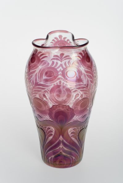 Kör alapú, körteszerűen kiöblösödő test, kissé beszűkülő nyakkal, három, félköríves osztást eredményezően benyomott szájjal. Az egész testen a felső, rózsaszín réteg teljes, illetve részleges lemaratásával kialakított, különböző rózsaszín árnyalatú, stilizált, keleties-magyaros, illetve a nemzetközi szecesszió hatását vegyítő, stilizált pávatollas ornamentika. A szájperemet rózsaszín csík kereteli, az egész felület selymesen irizáló.