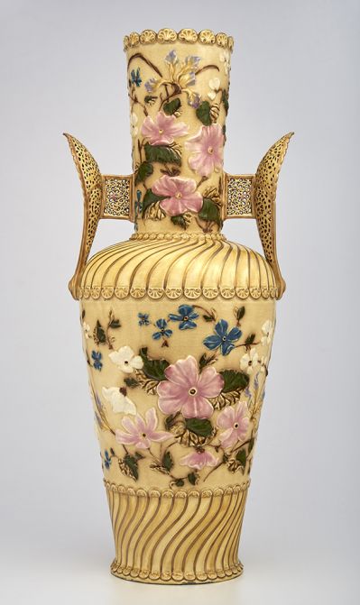 Technika: | aranyozott; áttört díszítés; csavartan bordázott; öntött elemekből összeállított; plasztikus díszítés; színes mázakkal festett |