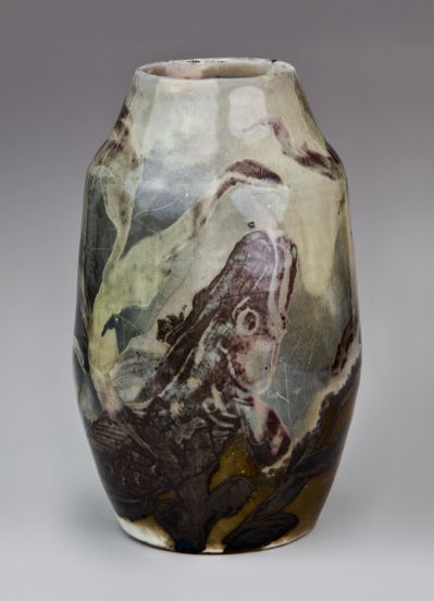 Felfelé szélesedő, hengeres vázatest, felfelé kúposan szűkülő nyakkal. A felület díszítménye: lüszteres reflexfényű barnás, szürkés, zöldes foltos alapon vízinövények közt felfelé úszó hal.