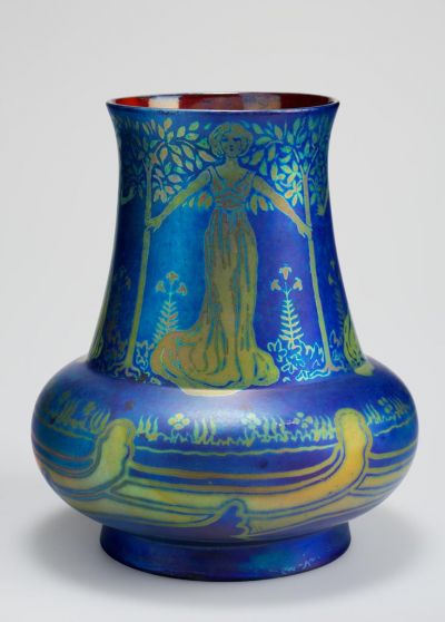 Kerek, gyűrűs talp felett erősen kidomborodó test, széles, kürtőszerűen keskenyedő magas nyakrész, enyhén kiszélesedő, sima, kerek száj. A gömbölyű testen körben ismétlődő stilizált hullámvonalak jelzik a patakot, melynek partján négy, finoman meghajló hosszúruhás leányalak táncol, liliomok és narancsfák között. Az ismétlődő elemekből kialakított ábrázolás az angol grafikákra, nyomatokra emlékeztet. Feltehetően 1900 októberében, Walter Crane pécsi, a Zsolnay gyárban tett látogatása ihlette meg a gyár alkalmazásában álló fiatal, önmagát „szecesszionistának” valló Nikelszky Gézát. Walter Crane egyetlen ismert Zsolnay gyári vázája is a komplementer színek ellentétére épít (Ltsz. JPM. 51.6491.1). Itt az acélkék alapszín párja sárgásszürke, amelynek az eozinmáz ezüstös reflexet ad. Feltehetően a sötétebb alapszínre festették a világosabb színű ábrákat. A savmaratás tompa fényűvé tette a selymes felületet. 1959-ben az Iparművészeti Múzeum kiállításán szerepelt.