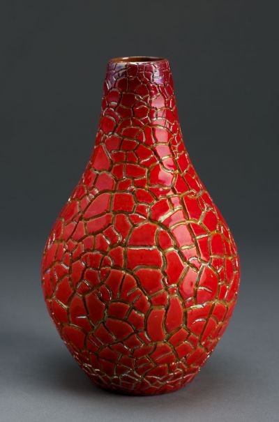 Technika: | eosinmázzal díszített; formába öntött; kétrétegű máz; vörös eosinmázzal fedett |
