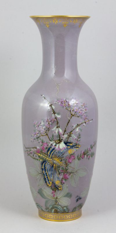 Kerek, egyenes talpon, magas, tojásdad vázatest, magas, egyenes nyak, kiszélesedő, sima szájperem. Az enyhén lilába játszó galambszürke alapra finoman naturális díszítést festettek, a zöld, a lila, a kék különböző árnyalatait mutató színezett, domborúan felhordott porcelánmasszákkal. A talpgyűrű geometrikus, arannyal festett mintázatából, mint alapból, nő ki egy-egy nagyvirágú hortenziaszál, közöttük egy-egy bimbós kisebb szál. Az egyik hortenziaszálat harangvirág gazdagítja, előtte egy óriás lepkével, arannyal könnyedén átrajzolt szárnyakkal. A természethű motívumok elrendezése japános. A festői kompozíciót a szájperemnél aranyozott finom növényi ornamentika zárja.