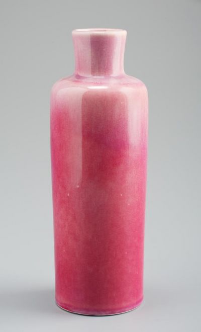 Egyenes talpon felfelé enyhén szélesedő hengeres test, gömbölyű váll, kissé szélesedő hengeres nyak, köralakú szájnyílás. A lilásrózsaszín alapszínt apró szálkás mintázatban világosabb, lefolyó máz tarkázza.