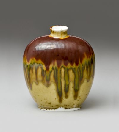 Két oldalról lapított gömbölyded vázatest, nyaka keskeny, ívelt, rövid, pereme kissé kihajló, a szájnyílás kerek. Egymásba olvadó sárga, homokszín, okker, halványzöld, világoskék, lila folyatott mázakkal díszített.