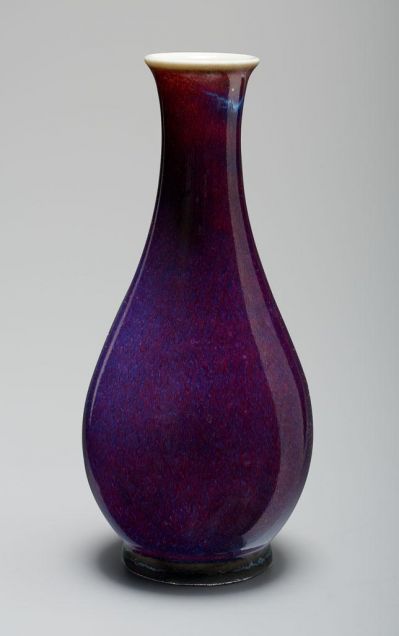 Alacsony talpgyűrűn nyújtott, tojásdad test, hosszú, karcsú nyak, kihajló szájperem. Máza folyatott, márványos, sötétlila és mályvaszínű.