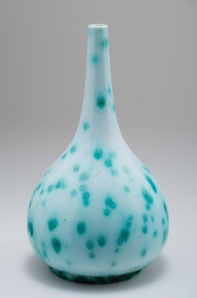 Keskeny talpgyűrű felett körteforma vázatest, elvékonyodó, magas nyakkal, szűk, kerek szájjal. Sima felületét krómzöld, kristályos mázpettyek díszítik a lilás, halványszürke alapon.