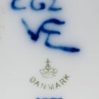 | Jelzés: | zölddel bélyegzett jelzés: korona alatt DANMARK felirat, ez alatt három sorban hármas hullámvonal máz alatt kobaltkékkel; máz alatt kékkel festett C 62 és összevont VE monogram |