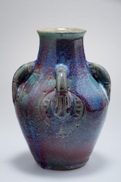 Körte alakú test, széles nyak, kissé kihajló szájperem. Az edény hasát és vállát négy enyhe ívű fül köti össze. A váza nyakán körben és a fülek illesztésénél benyomott körökből, rovátkákból és stilizált hármas levelekből alkotott geometrikus díszítés. Máza folyatott, márványos, világoskék, lila, szürke, vörös foltokkal.
