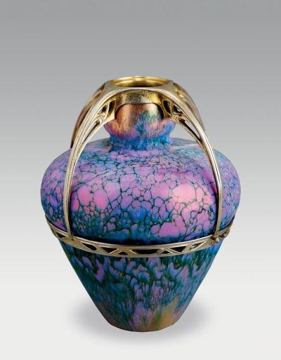 Apró kerek talpon kiszélesedő zömök edénytest, erőteljesen beszűkülő vállal, rajta rövid hengeres nyak. A váll alatt körpántról négy áttört bordadísz fut fel a váza szájpereméhez. A teljes felületet borító finom, rafinált színátmeneteken alapuló, irizáló hatású zománcdísz Rapoport több munkáján megjelenik ezeket - csakúgy, mint e darabot - az 1902. évi torinói kiállításon aranyéremmel tüntették ki.