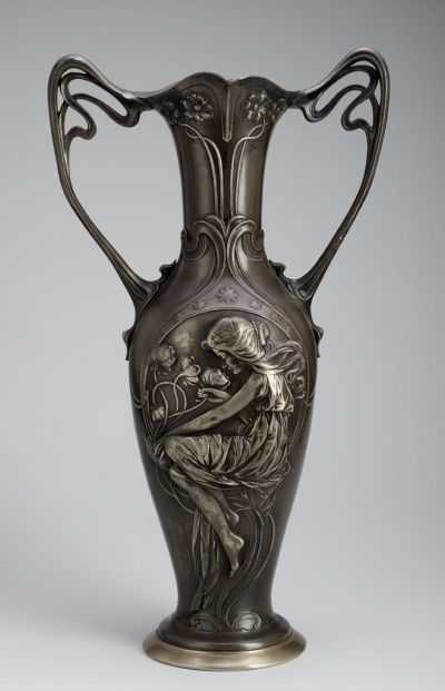 Karcsú, felfelé szélesedő, hosszú nyakú váza, kihajló, karéjos szájperemmel. Vállából kiinduló két, S-alakú, áttört fülét külön öntötték, majd applikálták a plasztikus díszítésű vázatestre. Egyik oldalán karcsú virágszálak meghajló szárain ülő nőalak. Feje fölött csillagos baldachin és a szájperemig szimmetrikusan fölívelő két-két virágszál. Hátoldalán középen, ugyancsak szimmetrikus elrendezésben hasonló, bimbós-leveles-virágos növényi dísz.