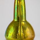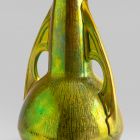 Kerek, egyenes talp fölött félgömb alakú vázatest, melyhez magas, csonkakúp alakú nyak csatlakozik. Kétoldalt vastag lapból formált íves fül, a szájtól a gömb alsó görbületéig. A nyak csatlakozásánál félköríves áttörés felületén egyszerű, geometrikus, domborműves díszítés, amelyet fényes vonalak hangsúlyoznak. Az edény aranyoszöld fémlüsztermázzal fedett, az alapmázat a savmaratás előtt a mintázatot követve részlegesen védő bevonattal látták el. Így keletkeztek a száj körül és a fül matt felületén a fényes kontúrvonalak, a váza nyakán, testén a matt felületen fényesen kirajzolódó, függőleges vonalmintázat finom erei.