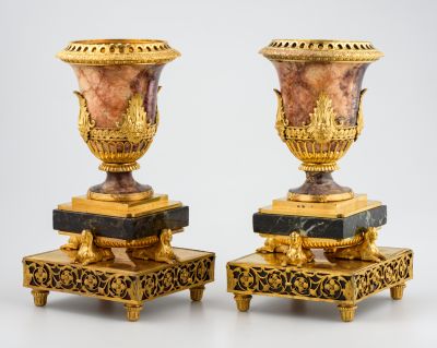 Négy tagolt, vájatos, gyöngysoros díszű lábon, négyzetes hasáb alakú fekete márványtalapzat, felületén virágos áttört indadísszel. Tetején négy öntött szfinksz, fehér erezetű, hasábos márvány tagozatot tart, amelyen ametiszt urna áll. Ennek alsó része tűzaranyozott bronz montírozású, áttört és groteszk maszkokkal díszített. Szájperemén vésett, rovátkolt levélsormotívumos áttört díszítés.