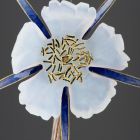 Kettécsavarható, enyhén ívelt ezüst szár végén lecsavarható, homályosra maratott, áttetsző, kékesen opalizáló üvegből készült ötszirmú vadrózsa (Rosa canina). Szirmai közt egy-egy hosszúkás, keskeny csészelevél, belsejében apró bibék tömege. A csészelevelek kék, a bibék zöldes zománccal borítottak.